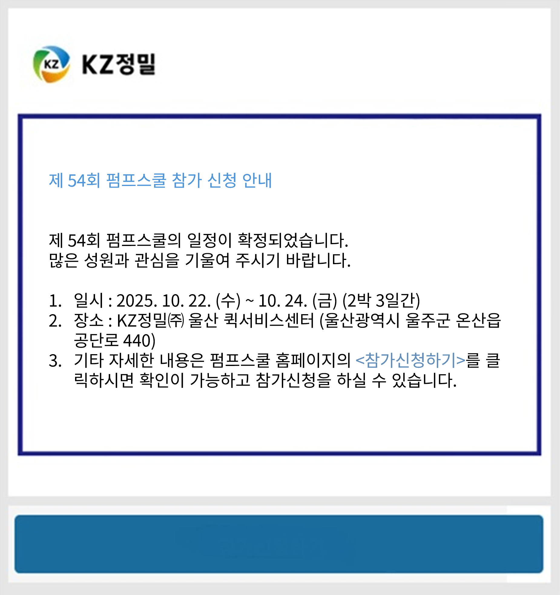 게시판 내용 제 54회 펌프스쿨 참가 신청 안내 관리자 조회수 : 153 | 2025-09-01 KZ정밀주식회사 참가신청하기 게시판 이전/다음글 이전글 제 53회 펌프스쿨 참가 신청 마감 안내 다음글 제 54회 펌프스쿨 참가 신청 마감 안내