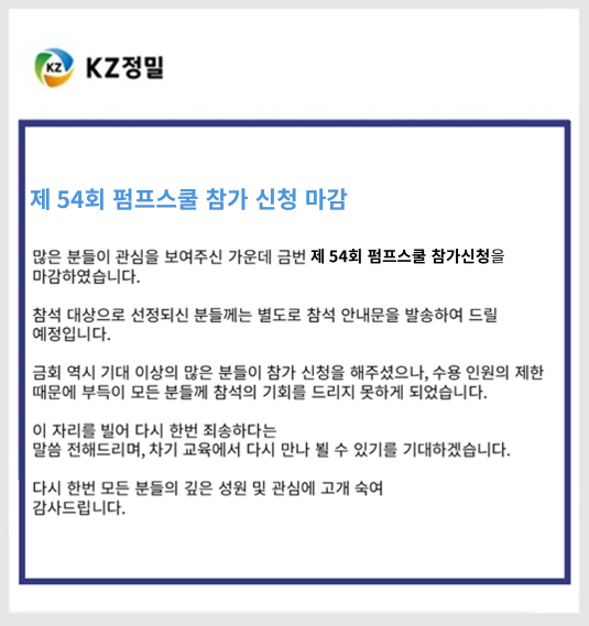 게시판 내용 제 54회 펌프스쿨 참가 신청 마감 안내 관리자 조회수 : 81 | 2025-09-17 제 54회 펌프스쿨 참가 신청 마감 안내 게시판 이전/다음글 이전글 제 54회 펌프스쿨 참가 신청 안내 다음글 다음글이 없습니다.